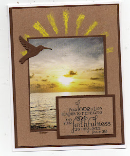 I enjoy the challenges at Classy Cards 'n Such - this one is more of a challenge due to my limited supplies, but I managed to combine a rooster (SU Provencal); the colors, and a product - the Freedom Tear Drops I just received as a prize from them. The sentiment is Recollection, and the embossing and die cut are Cuttlebug.